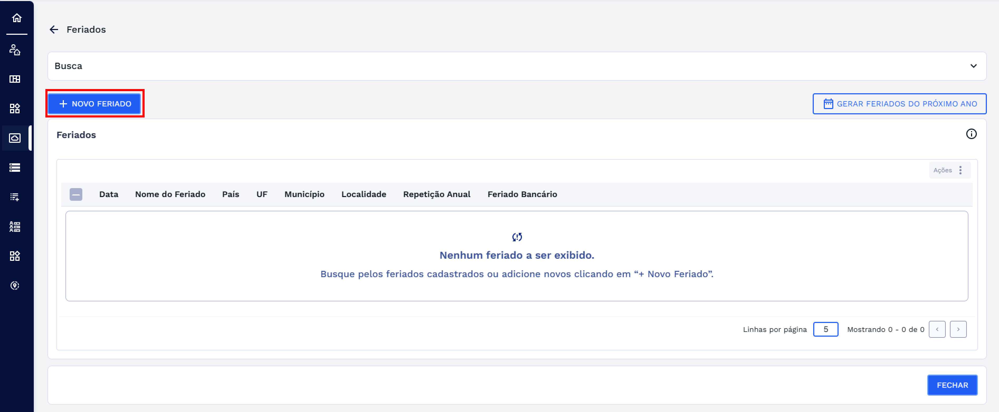 Para cadastrar feriados, clique em + NOVO FERIADO.
