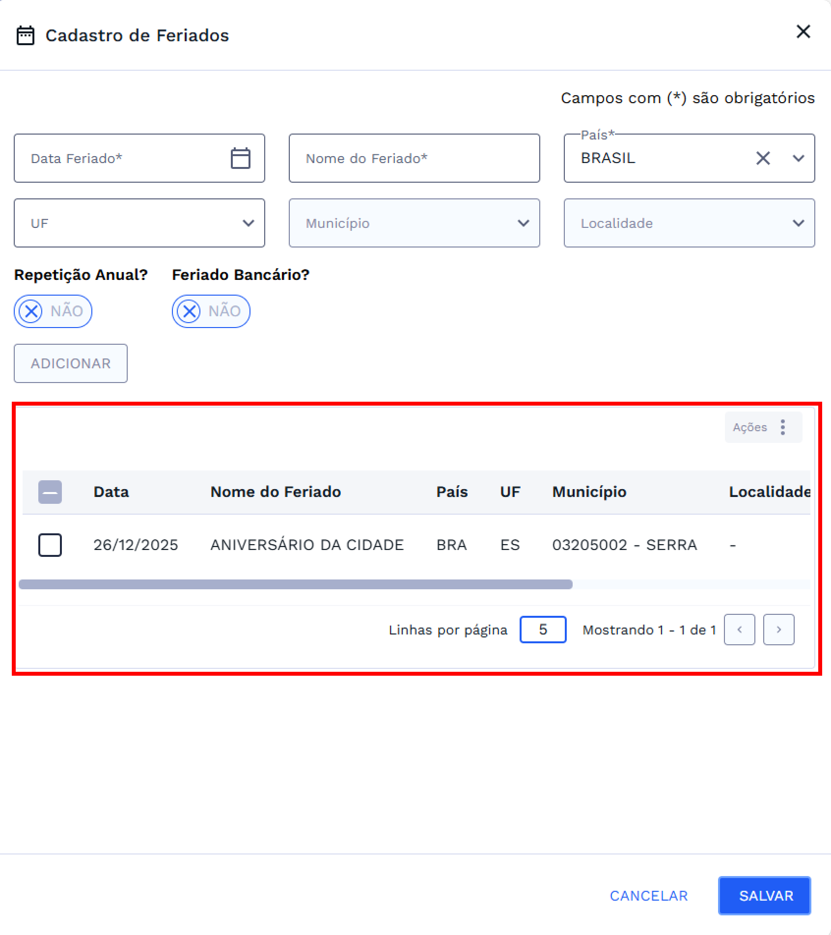 Com os feriados registrados na tabela, clique no botão SALVAR para finalizar o cadastro.