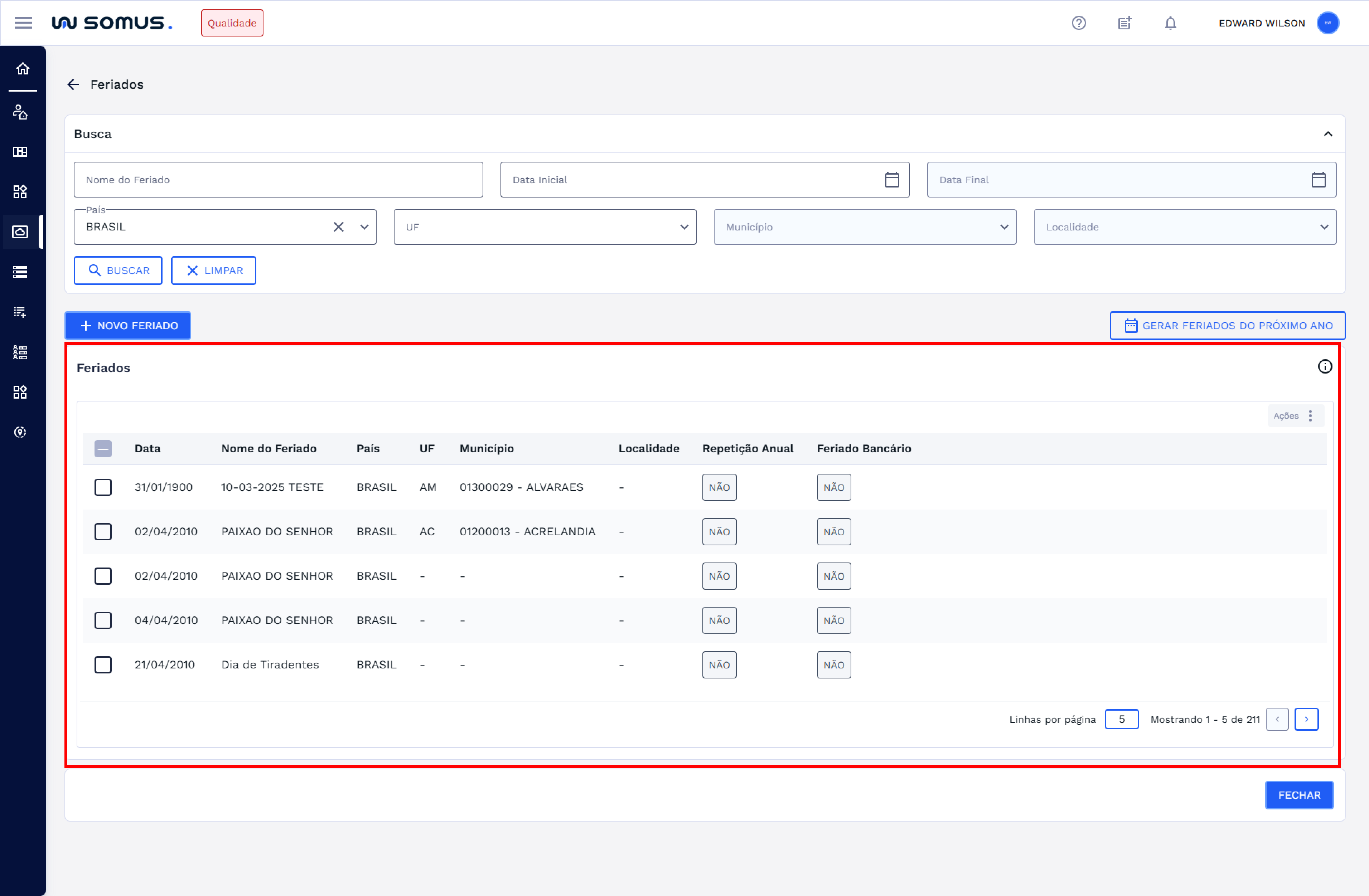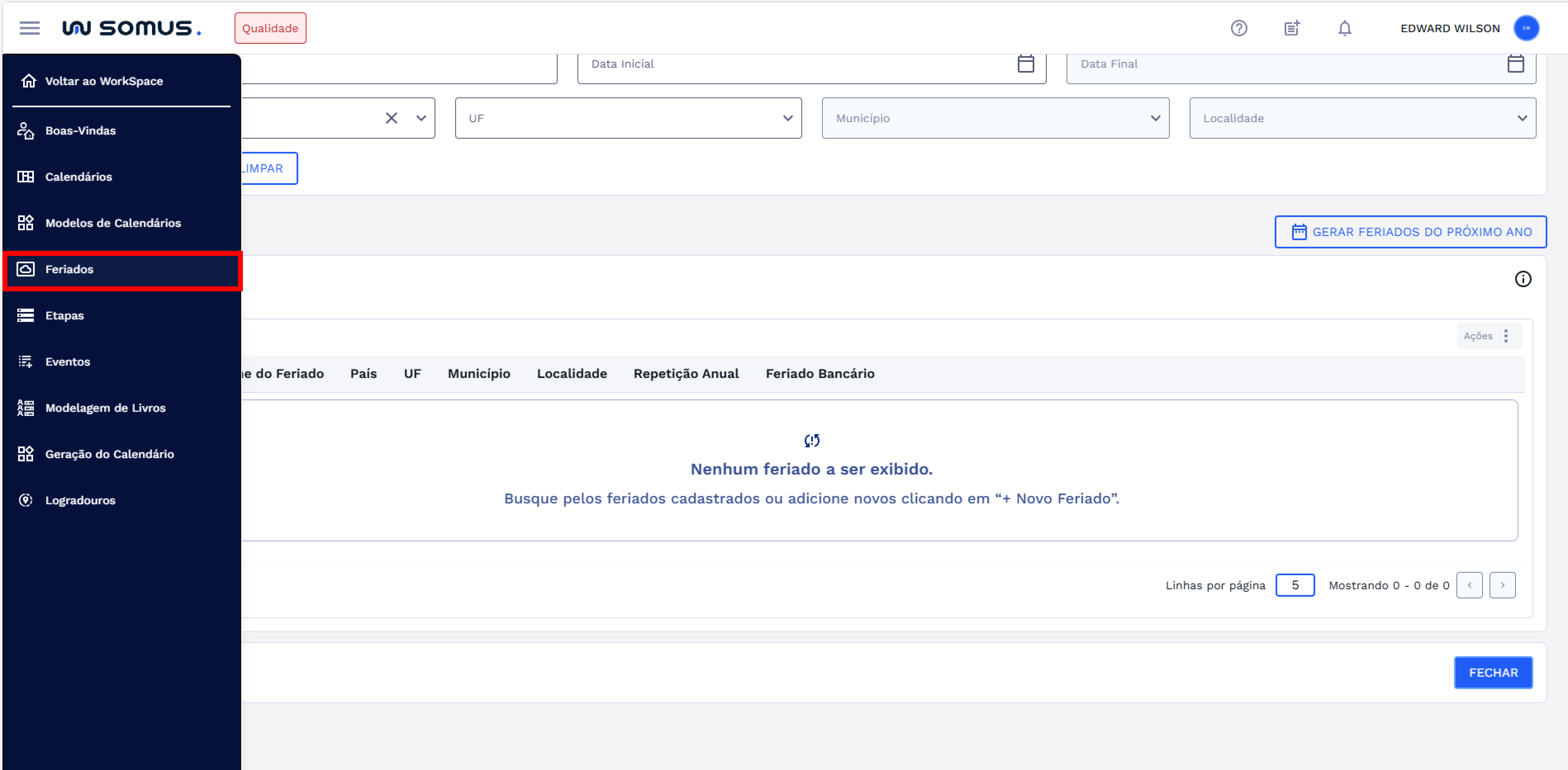 Para editar um feriado, selecione o feriado desejado na tabela, clique em AÇÕES e, em seguida, clique em EDITAR no lado direito da tela.