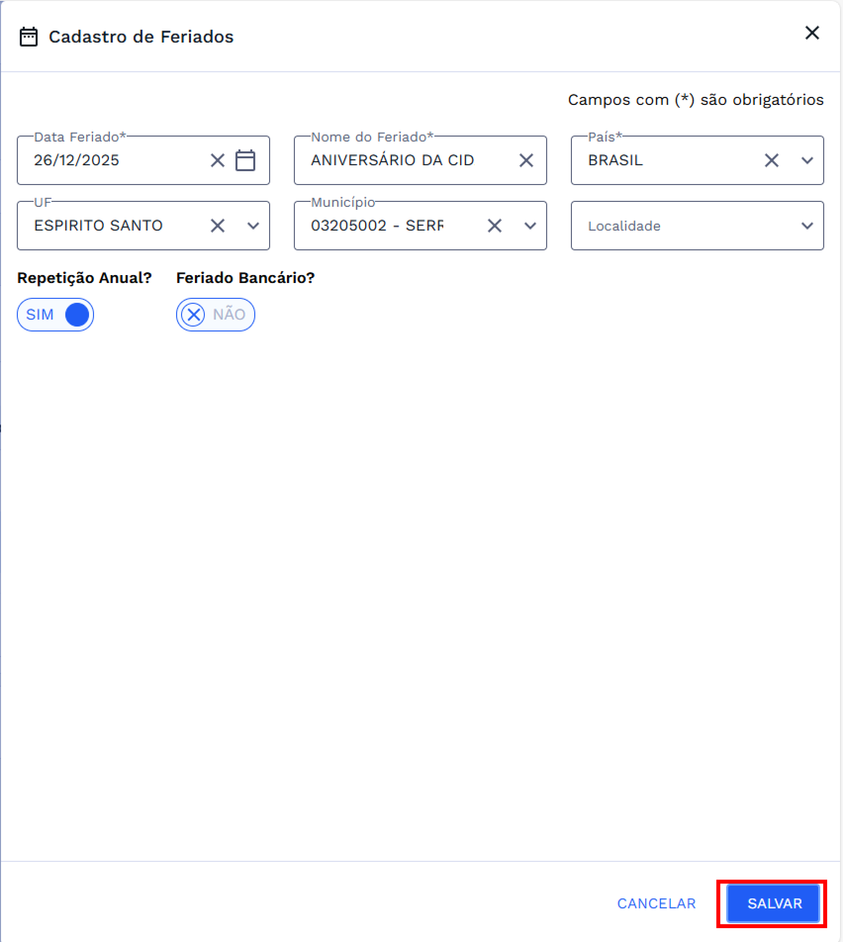 O formulário contém campos obrigatórios e segue uma dinâmica específica para o preenchimento da localização geográfica. O campo País já vem preenchido. Para cadastrar feriados nacionais, basta manter apenas esse campo preenchido. Para feriados estaduais, é necessário informar a UF. No caso de feriados municipais, ao preencher a UF, o campo Município será habilitado. Após selecionar o Município, o campo Localidade ficará disponível para preenchimento.