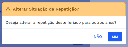 IMPORTANTE: Caso você altere o status de repetição do feriado, ao SALVAR, após a caixa de diálogo de confirmação, você verá uma segunda confirmação na tela. Nessa etapa, poderá escolher se as alterações serão aplicadas apenas ao feriado vigente ou a esse feriado em outros anos.