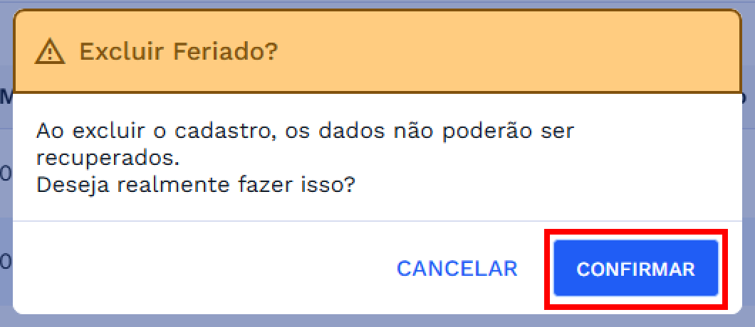 Após sua escolha, o sistema excluirá o feriado permanentemente, e os dados não poderão ser recuperados.