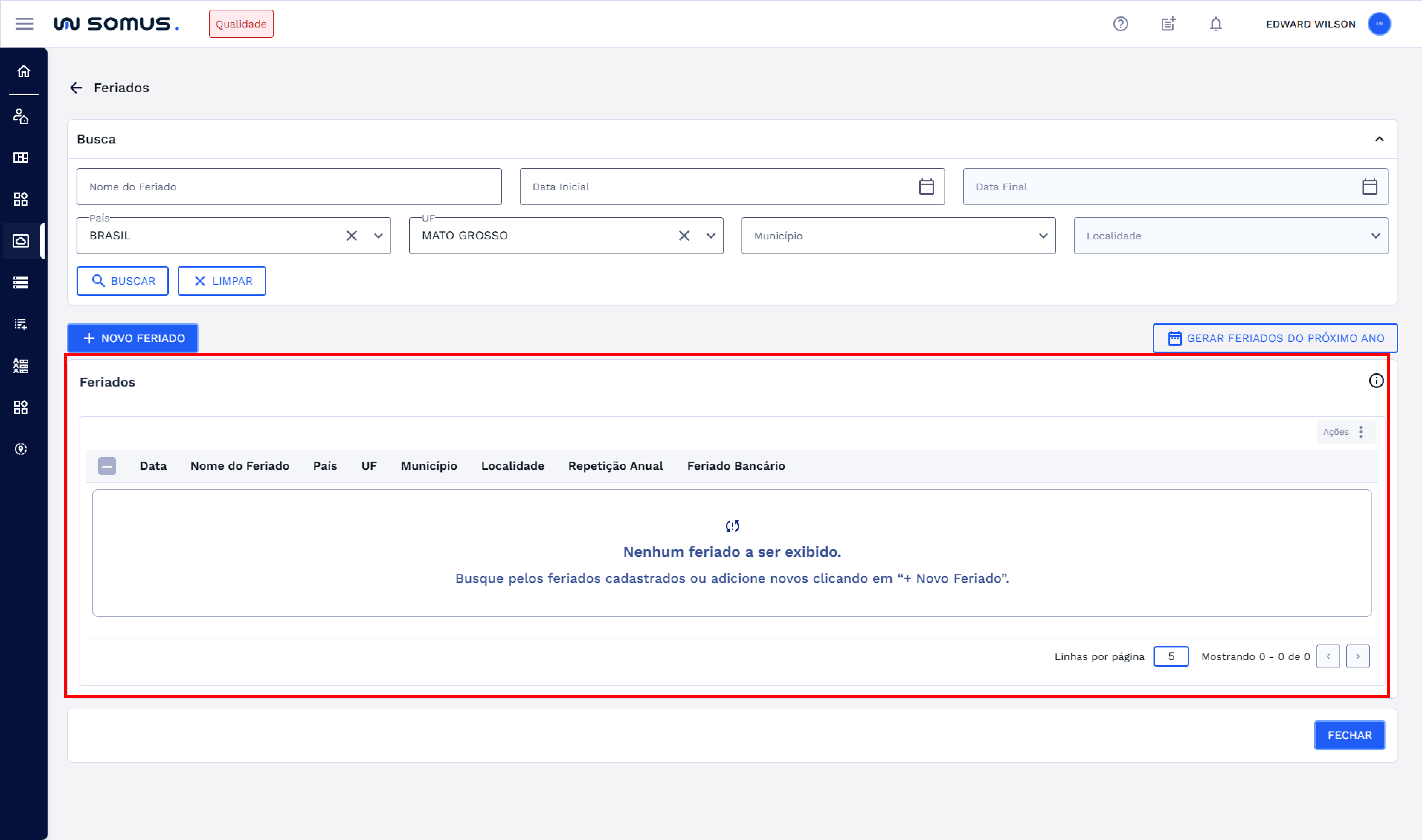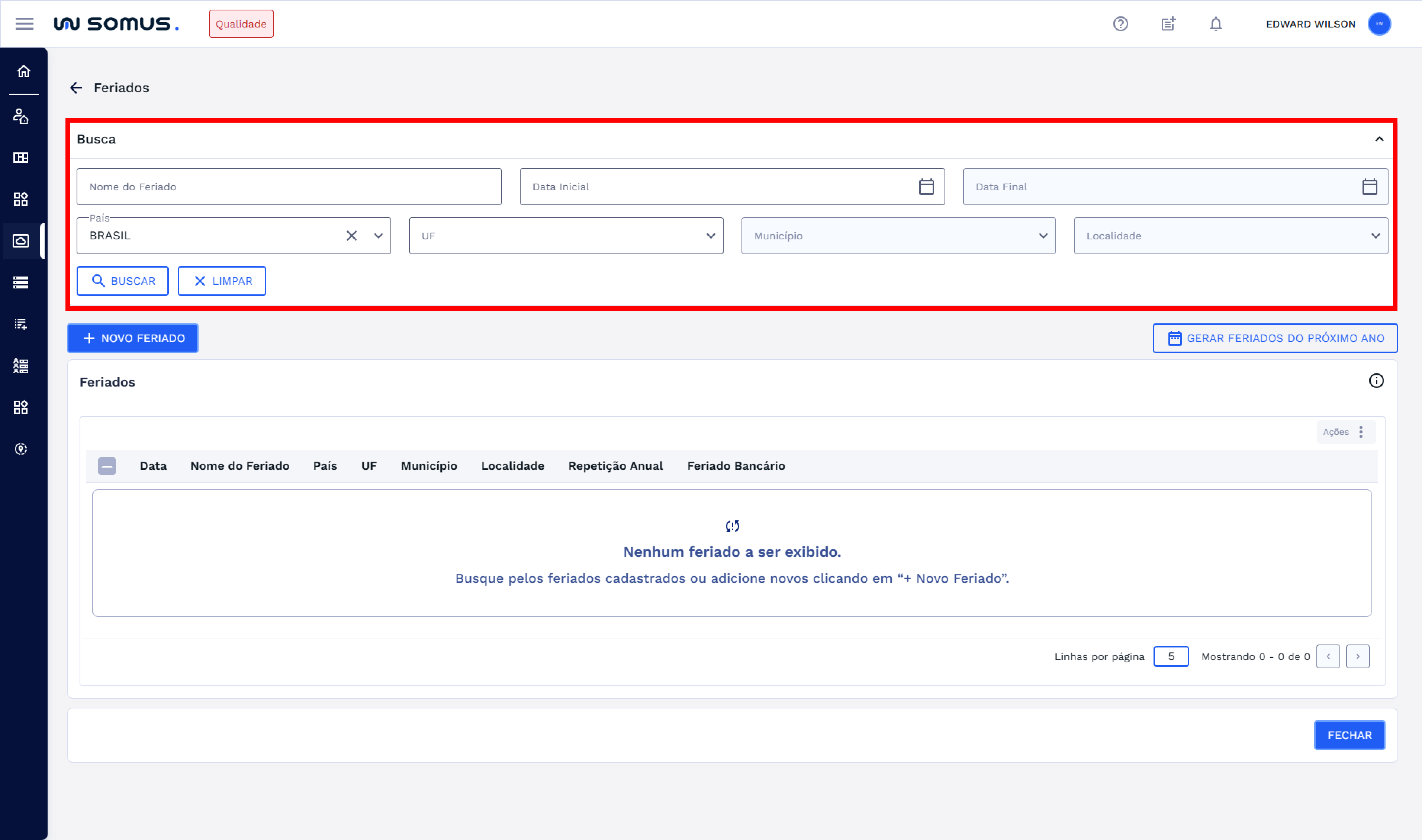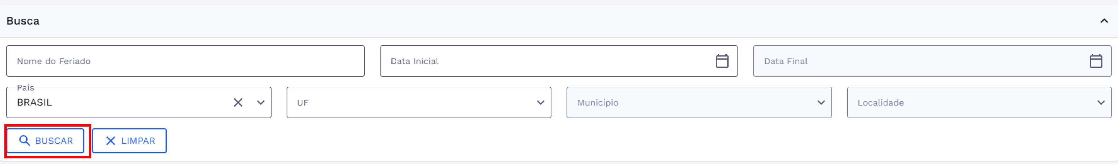Para acessar os feriados cadastrados e executar as ações disponíveis, é necessário realizar uma busca utilizando os filtros da área de pesquisa.