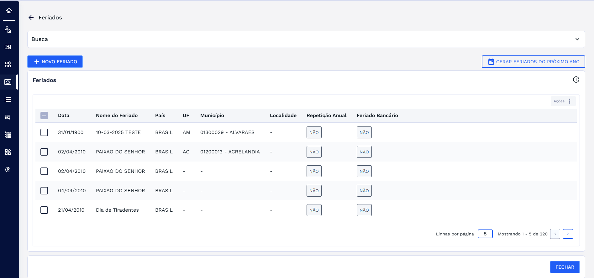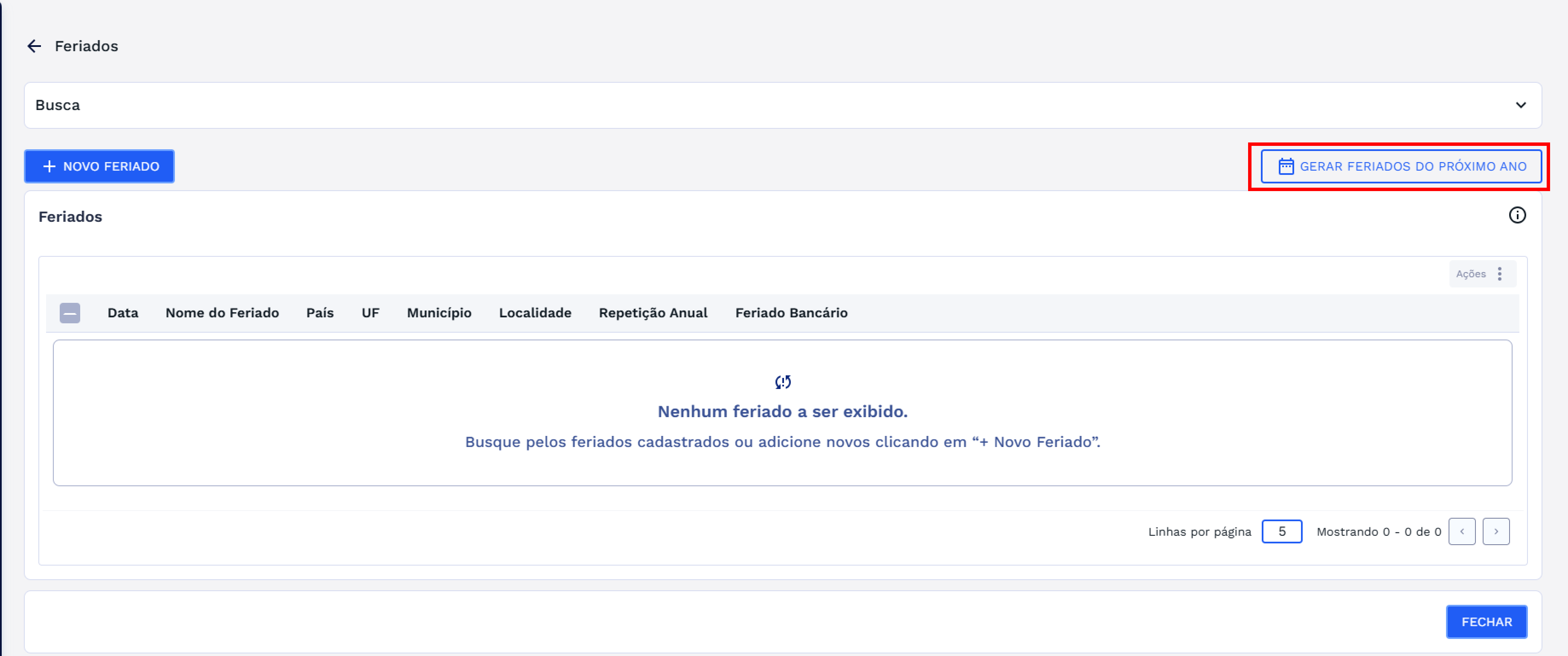 Você pode gerar automaticamente os feriados do próximo ano clicando no botão GERAR FERIADOS DO PRÓXIMO ANO, conforme mostrado na imagem.