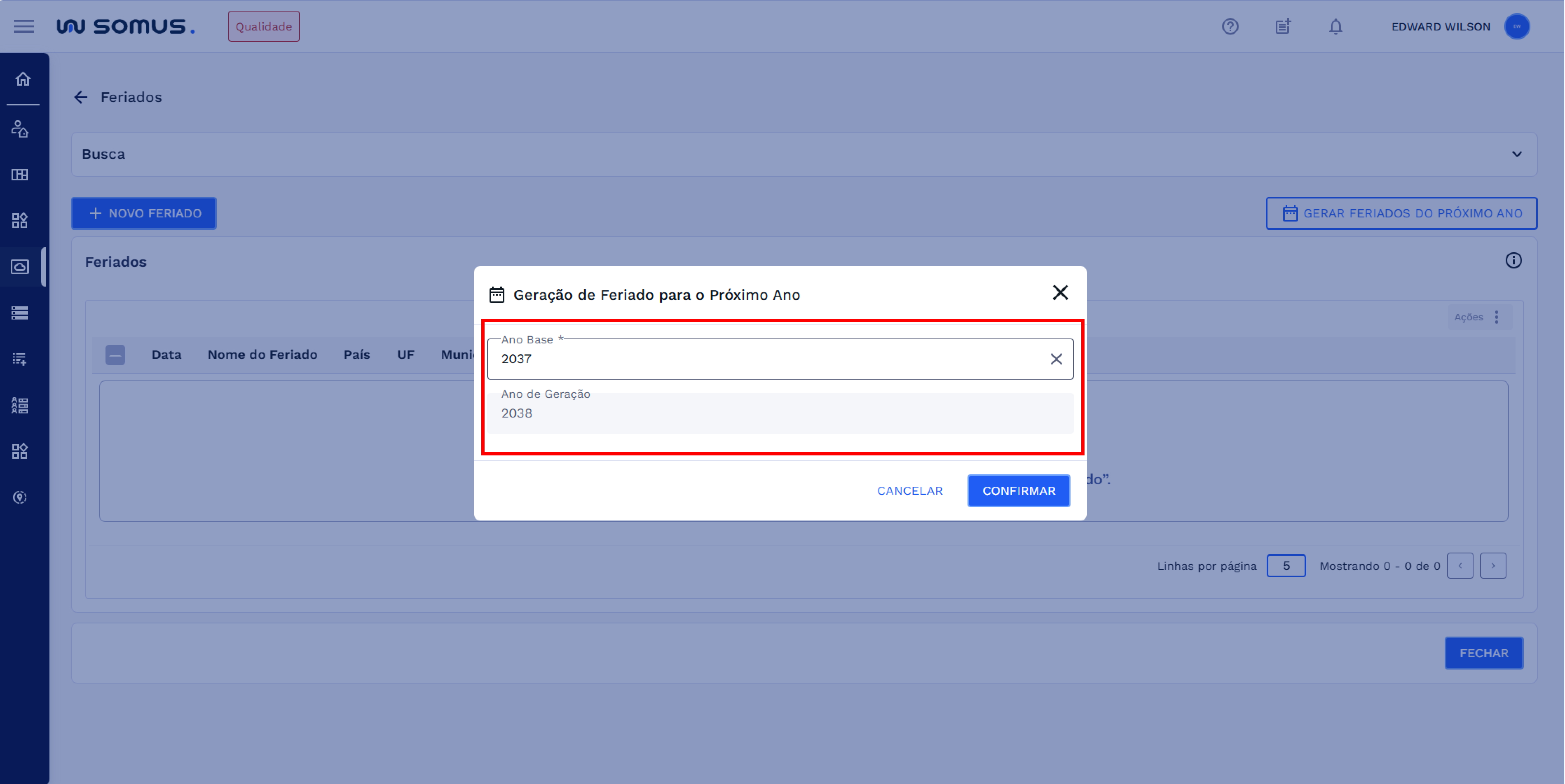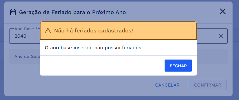 O processo de geração de feriados do próximo ano inclui duas validações após o preenchimento do campo Ano Base, que podem impedir a geração dos feriados.