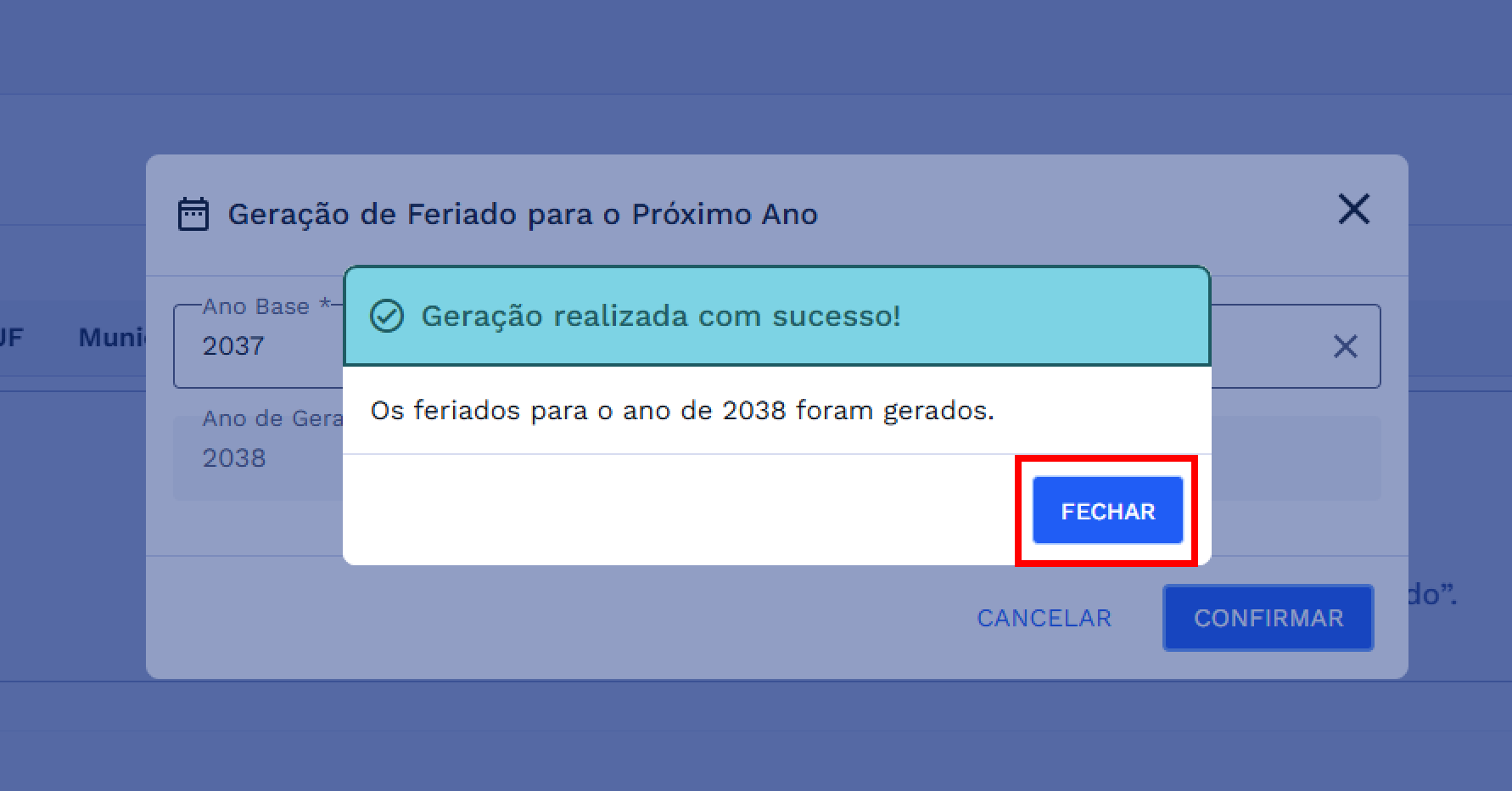 Ao clicar, será aberto um formulário para a geração de feriados.