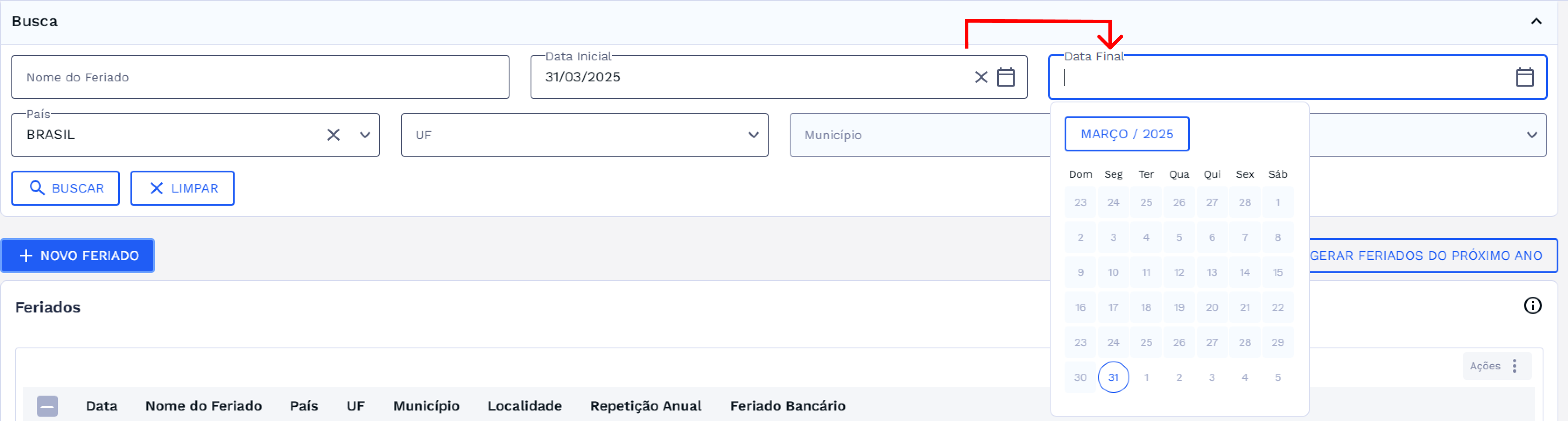 - Filtro por período Ao filtrar os feriados por período, é necessário utilizar os campos Data Inicial e Data Final. O campo Data Final só será habilitado para preenchimento após a Data Inicial ser informada.